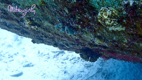 Sakari and I had managed to circle almost the entire length of the ship and was coming around the corner when I see the hubby motioning me to COME!! He kept pointing underneath the ship and giving me the BIG hand gesture. I wasn't seeing anything. He kept pointing. Still nothing. Now most of the area we were in was a sandy bottom so that meant there was a lot of sand kicked up from both us divers and whatever was under that ship. I couldn't see anything. Whatever it was, I had missed it darnit.