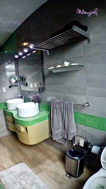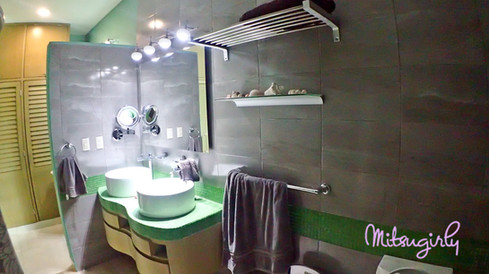 Now the shower...it's somewhat on the small side. It was round and had a shower curtain around it. There are built in shelves in the wall to hold soap, shampoo, conditioner and body wash. I do have to say that I really wished that the other shower was in here instead. This thing was just a tad bit small for it to be a master bedroom bath. Just my opinion.