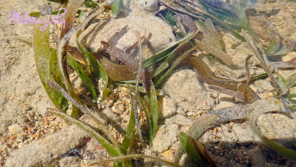 Then newbie says "Here's an eel" and everyone ran over. She had found a baby moray eel hiding under the rocks. She squeals "It's so cute!" and it was. It blended in nicely with the sea grass. Do you see it? Looks like a piece of sea grass with eyes.