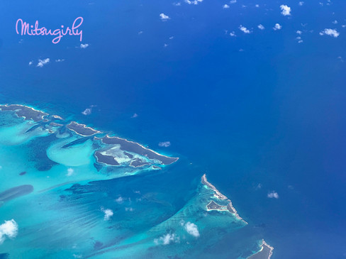 After a short while, we started noticing the beautiful water below and the little islands. Now those of you that have read my land reviews know that I use an app called MapsMe. You do not need service to use it and I program all the places (book mark) prior to going to an island so that we have our own GPS to get around without having service on our phones. Well, I would discover this trip that it also works in the air and when I pulled it up, it would tell me what islands we were next to. How cool is that? These two pictures were taken prior to me discovering the app worked in the air. So, I have no idea what they were.