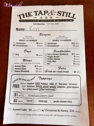 We decided to just head back to the resort but I could hear Karl's belly growling in the back seat and the hubby and I decided to try out a place we had seen down the road from us. Instead of pulling into the resort, we passed it right up. The kids had no idea what was happening until we pulled into a place called Tap and Still. Karl's eye's lit up and we didn't have to tell him twice what we were doing. Daniel #1 had told us this was a good place to eat so why not try it out.