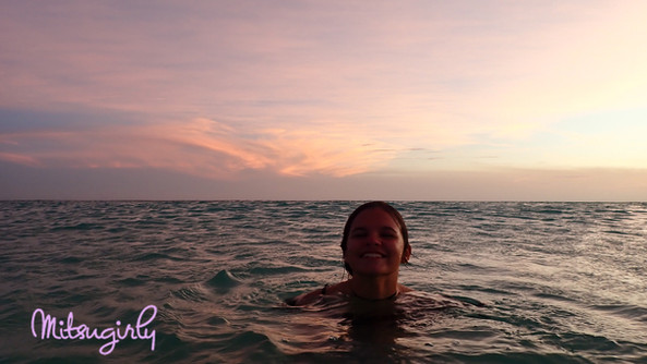 By accident, I learned something pretty cool. I had turned my camera off and then back on, so the flash was on unknown to me. The camera defaults to flash every time you turn it on (and it's quite annoying because I hate the flash and always have to turn it off) and I took the next picture of Sakari doing handstands in the water. It made for a pretty neat picture with the blue in the water and the sunset background.