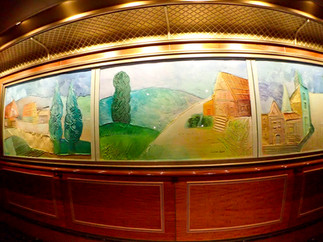 The Artist Lobby (or atrium). The murals on the ceilings are plentiful and depict life during the 19th century in Paris and atrium the is 7 stories tall reaching the top with a glass ceiling.