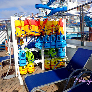 Something VERY INTERESTING...and I'm not sure if this is coming out on ALL the Carnival ships...but kudos to Carnival for doing this. I imagine with all of the drownings of children, they have come up with a partial solution. They had life jackets out on the deck for people to use if needed. Now let's just hope those parents that know their children can't swim or are not good swimmers, use them.