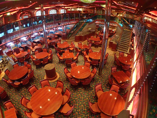 The 2 main dining rooms are the Renoir Restaurant and the Monet Restaurant. Both are located on deck 3 and 4 with the opening in the middle. There are Eiffel Tower work there with a "sky" ceiling and clouds and domes. Both basically looked the same to me, just located at different areas.