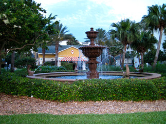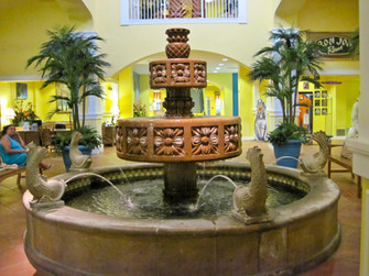 Pulling up to the resort, looks nice, beautifully landscaped, flowers, fountains, stone driveway: