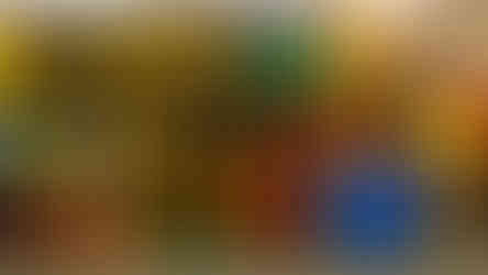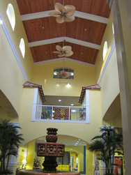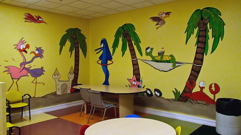 A huge beautiful mural toward the back of the lobby area heading out to the pool