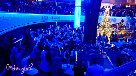 Tonight was the Electric White Night party. I guess something like the White Hot party that NCL does. However, they have this IN THE ATRIUM! Yikes. It was packed but a lot of fun and a lot of good music. Sakari had already decided she didn't want to stay at the kids club and checked herself out and went back to the room. I went back and told her that we would be picking her up after the comedy show for the white hot party and they had balloons.