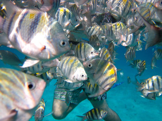 One of the locals told us that the water is calmer more to the right (while facing the beach) than to the left. So, we headed down that way. There were a lot of places along there to enter (maybe 7 or 8???). Immediately there were fish EVERYWHERE….WOW. What a beautiful site! Some places had metal steps to walk into the water (then dropped off at the last step) and others just had huge rocks placed as steps. They are slippery, so be careful. I would walk down far enough to get my fins on then pretty much dive in to keep from walking on the steps. We start toward the right and worked our way toward the left. I could not believe how clear the water was and just how many different types of fish we seen all by the areas along the shore line entrances. You could just swim up and down there and see tons without even going out.