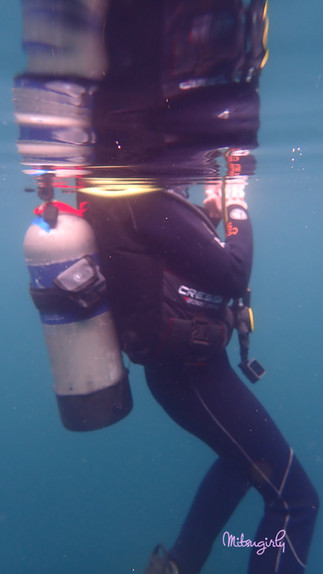 Time to practice buoyancy a little more...the DM took out a string and tied it to a line down to one of the platforms. Then he handed it off to Sakari. She is not very good at tying her shoes and never has been. She still makes the bunny ears like you do when you are first taught to tie shoes. She usually does it a few times to get it right and tight. So, here she goes. She tied the knot on the line and backed away. She thought she was done. LOL Nope, tie the rest of it he signaled to her. She eventually got it but man the struggle was real, especially in the water. Now it was my turn. I was tying it and somehow wasn't actually paying attention to the line and bonked my head into it. LOL I guess I failed that test? 🤷♀️