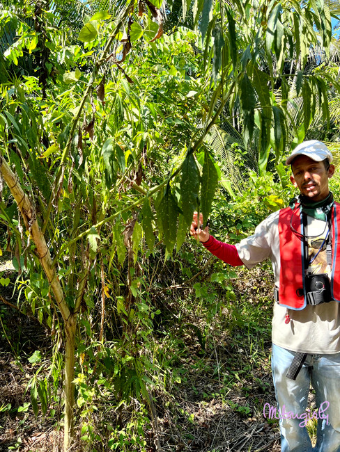 He started telling us about these trees. This was called a trumpet tree. It is a fast growing evergreen tree and reaches up to 65 feet tall. It has fruit that can be eaten raw and it also has a medicinal use for numerous ailments for the liver, kidney, heart and hypertension. The branches are hollow and can be used as blow tubes or trumpets. The inner branches is used as a tough fiber used for socks, ropes and so on. The leaves can be used as sandpaper to build houses because of its rough texture and the trunk has latex used in rubber. Of course all the kids wanted to do was hang on them and shake them.