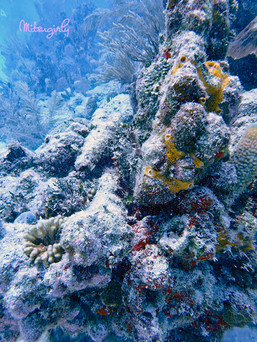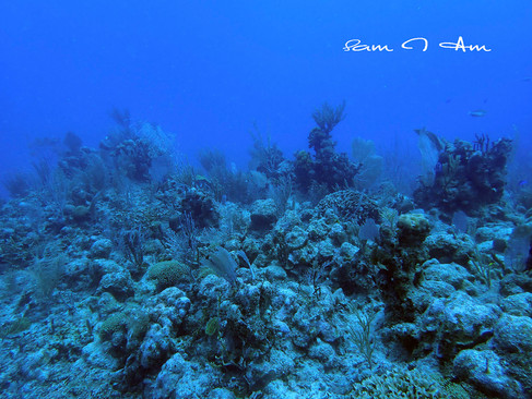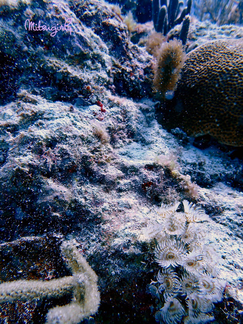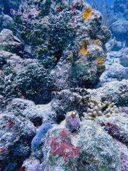 As soon as I hit the water the waves started taking me toward the boat and the propeller, which was moving and I hit it with my leg. The motor wasn't on, but the water was making it spin and it freaked me out. I tried hard to get away from it and over to the line. I was kicking like crazy and grabbed the line. I was having flashbacks of my terrible experience in Cozumel. I started to panic. I wasn't sure how this dive was going to go at this point. I told the girl instructor how dissatisfied I was with the way they were rushing me and making me go before the hubby. I told her "There's one thing I don't like and that's to be rushed. Don't rush me!" She got the point and once the hubby got in she let me go down the line at my own pace.