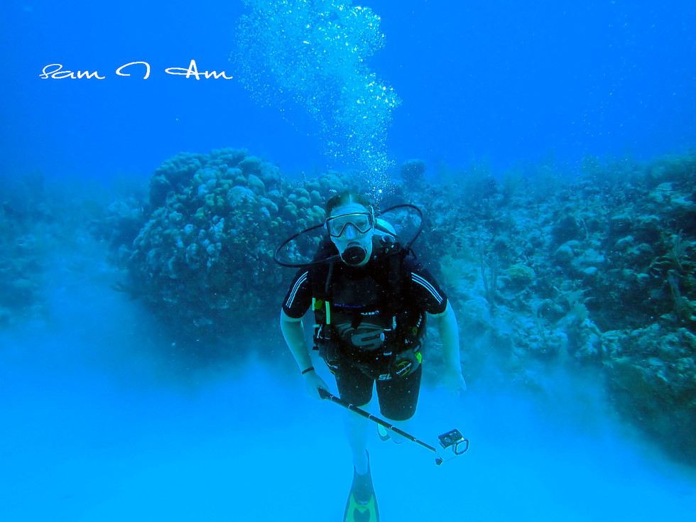 Then once again they told me to go. Argh! I didn't know how I was supposed to do this. They had me put the tank on and any weight on my foot still makes it hard on me to walk or stand up or anything...especially on a moving boat. I got up and made my way over to the end of the boat. Then told me to take a step off the edge. We had a girl instructor with us and she was going to be with us as well. The guys on the boat kept telling me to go. I finally went but man they were aggravating me about it and rushing me.