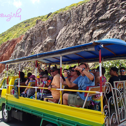 This will be our first time in St Kitts and I found plenty of options I was interested in. We were in port from 10am-8pm and I was super excited. Our roll call had someone that arranged a group "tour" with the main attraction being transportation to Cockleshell Beach/Reggae Beach. Since this was one of the places on my "list", I jumped right on this tour with everyone else, hoping to save some money. With this tour, they would pick you up in either an open air bus or enclosed, tour you around Basseterre and tell you a little about the history (everyone knows I don't do "tours" but this was just a little driving by it and telling you things along the way type of tour-no stopping). Then there would be a stop at the top of Timothy Hill for 10 minutes to get pictures. Then on to Reggae Beach where they would have a reserved chair, umbrella and complimentary drink waiting on you. Then it included your ride back to the port, with the options of 2 different times to leave (early and late). This was booked using PEREIRA TOURS and the cost was $15pp. It sounded like a great deal to me and we went for it.Of course, I know just from trying to get "my group" of kids and grand-kids together on any particular cruise...is quite the challenge. Our group to Reggae consisted of about 108 people. Yikes! I really wondered how it would go and several times I felt as if I should just pull out of this group tour. I mean was it really worth saving a few bucks on a taxi ride? We'd soon see.